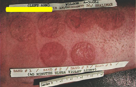 Hier geht’s zu einem englischsprachigen Blogartikel, der in der Mitte ein Bild von einem menschlichen Arm zeigt, dessen runde Probenfelder verschiedene Entzündungsgrade nach dem Auftrag einer 1-%-igen Verdünnung von Bergamotteöl und folgender UV-Bestrahlung zeigen. Die obere Reihe zeigt das Ergebnis nach 20 Minuten, die untere nach 40 Minuten. Hier ist das Bild direkt verlinkt.